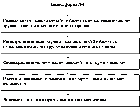 Рабочий документ использован / не использован при составлении аудиторского отчета (нужное подчеркнуть) Аудитор ____________ «12» апреля 2010г. В процессе аудита выявлены незначительные нарушения в организации ведения первичных документов, однако данные нарушения не могут повлиять на мнение внутреннего аудитора о достоверности бухгалтерской отчетности за 2009 г. 2.4. Аудит системы начисления заработной платыДалее проведем установление соответствия показателей аналитического учета расчетов по заработной плате с записями в главной книге и отчетности на одну и ту же дату. Для этого сверим сальдо по счету 70 «Расчеты с персоналом по оплате труда» на 1 января 2010 г. в Главной книге и в балансе предприятия, составляемом во внутреннем учете. В балансе по счету 70 «Расчеты с персоналом по оплате труда» развернутое сальдо: кредитовое, отражающее задолженность хозяйства рабочим и служащим по заработной плате (руководство объясняет его отсутствием денег на расчетном счете), и дебетовое, показывающее задолженность рабочих и служащих хозяйству по заработной плате, что свидетельствует о плохой организации расчетов с работниками (выплачено больше, чем причитается). Контрольная сверка показала, что эти суммы совпадают с данными Главной книги. В самой же Главной книге обнаружено много исправлений; бухгалтер по оплате труда объясняет это неточностью подсчетов еще в первичных документах (все исправления подписаны бухгалтером). Убедившись, что данные Главной книги и баланса совпадают, можно продолжить дальнейшую сверку. Для этого сравниваем данные Главной книги со сводом начислений и удержаний по схеме 1. В расчетно-платежной ведомости по графам удержания показаны отчисления в Пенсионный фонд, профсоюзные взносы и подоходный налог; проценты отчислений высчитаны верно, их суммы совпадают с данными расчетных листков по каждому работнику (льготы по подоходному налогу определены верно). Платежных ведомостей на аванс аудитору представлено не было: авансы уже давно не платятся.