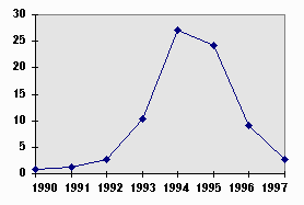 Эпидемия дифтерии началась в России в 1990 г. и к концу 1994 г. распространилась на все бывшие республики Советского Союза. Около 90% случаев заболевания в мире в период с 1990 по 1995 г. регистрировалось в этих государствах. В России с 1992 года начался резкий подъем заболеваемости дифтерией. В 1993 году практически на всех административных территориях России рост заболеваемости продолжался. Заболели 15229 человек, из них 4503 - дети. Показатель заболеваемости на 100 тыс. населения составил 10.3 и в 4 раза превысил таковой за 1992 г. На 20 территориях показатели заболеваемости превышали среднереспубликанский. Самые высокие уровни заболеваемости зарегистрированы в Москве (28.3 на 100 тыс.), Санкт-Петербурге (51.7), Приморском крае (42.5), Ленинградской (36.9), Тверской (25.3) и Новгородской (23.5) областях. Высокие показатели заболеваемости были в Калининградской, Курской, Саратовской областях и Краснодарском крае. Заболеваемость на этих административных территориях выросла в 5-10 раз. Начался подъем заболеваемости в Западно-Сибирском регионе: в 4 раза по сравнению с 1992 годом увеличилось число больных в Тюменской, Омской и Томской областях. В возрастной структуре заболевших самые высокие показатели заболеваемости отмечены среди подростков.