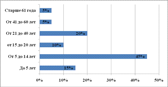 Рис. 2.1.1. Отдыхающие турбазы «Радужный берег» различных возрастов Турбаза «Радужный берег» является местом семейного отдыха, дети составляют примерно 1/5 часть от общего объема отдыхающих. Турбаза «Радужный берег» рассчитана на отдыхающих с достатком «средний» и «выше среднего». Половозрастной состав отдыхающих турбазы «Радужный берег» можно представить следующим образом (Рис. 2.1.2.). Таким образом, преобладающий возраст отдыхающих составляет 5-14 лет, в половом соотношении преобладает мужской пол.