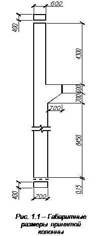 Высота нижней части колонны (до обреза фундамента) будет равна: H1 =H - H2 +0,15 = 12 - 4,3 + 0,15 = 7,85 м. Где значение 0,15 м есть расстояние от отметки пола до верхнего обреза фундамента Уточняем размер колонны: Н* = Н1 + Н2 = 4,3+7,85 =12,15 м, Т.к высота колонны при высоте более 10,8м должна быть кратна 1,8м, принимаем высоту колонны равной 12,6м Тогда Н*=12,6+0,15=12,75м Н1 = 12,75 – 4,3 = 8,45м Габаритные размеры принятой колонна приведена на рис. 1.1. Отметка головки подкранового рельса равна: ОГР = Н* - Н2 + Нcr , B + hr = 12,6– 4,3 + 0,8 + 0,12 = 9,22 м Проверка зазоров: Проверка зазора Δ1 - между краном и низом стропильной конструкции (Δ1 > 100 мм): Δ1