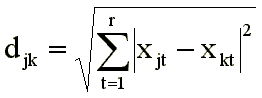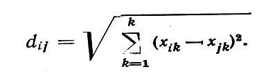 где dij - расстояния между точками на любой конкретной интерации в терминах n•k координат xik точек в k–мерном эвклидовом пространстве; они определяются с помощью обычной формулы расстояния: