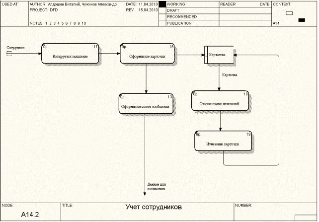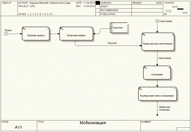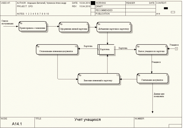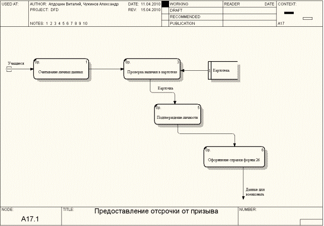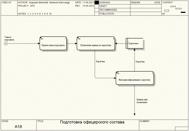 Российский Государственный Университет нефти и газа им. И. М. Губкина Кафедра автоматизированных систем обработки информации и управления Курсовая работа по дисциплине «Проектирование КИС» Студентов группы АС-06-4 Алдошина Виталия Чужинова Александра Преподаватель: Кузнецова Л. В. Москва 2010Тематика рассматриваемого процесса: воинский учет в РГУ нефти и газа им. И. М. Губкина Цель работы: 1. описать основные свойства и характеристики рассматриваемого процесса; 2. в программе BPWin с помощью методологий IDEF0 и DFD описать и спроектировать рассматриваемый процесс (построить соответствующие схемы) и сформировать отчет; 3. в программе ERWin создать ER-модель данных рассматриваемого процесса. Описание свойств и характеристик процесса: Основным способом изучения предметной области был выбран опрос сотрудников второго отдела. В результате были получены слудующие сведения: "Основные виды деятельности второго отдела". · Основные виды деятельности второго отдела: 1) воинский учет всех категорий военнообязанных – студентов, магистрантов, аспирантов и сотрудников; 2) организация и проведение мобилизации. · Учет студентов начинается сразу после поступления – во второй отдел приходит приказ о зачислении и данные о студентах из деканатов. На основании этой информации на студентов заводятся карточки. Карточка переводится в архив после окончания университета. Архив во втором отделе свой. · Учет сотрудников начинается при их приеме на работу (заявление визируется вторым отделом). Производится проверка предыстории и военных документов принимаемого на работу. · Начиная с третьего курса студенты проходят обучение на военной кафедре. Соответствующая информация фиксируется во втором отделе и передается в военкомат. · Ежегодно каждому студенту вторым отделом выдается справка для представления в военкомат и подтверждения отсрочки от призыва в армию. Срок представления справки в военкомат – 1 октября (отсрочка дается на весь период обучения, однако каждый год она должна подтверждаться; справка – не единственный документ, подтверждающий учебу студента – по положению, информация об отчислении студента должна передаваться в военкомат (вторым отделом) в семидневный срок). · Существует набор критериев и признаков, определяющих порядок учета, призыва, отсрочки и бронирования. Критерии многомерные – зависят от возраста, воинского звания, занимаемой должности. · По мобилизации – основная функция второго отдела – формирование схемы мобилизации. Схема действует в рабочее время. В нерабочее время работает мобилизационная схема военкомата. Мобилизационная схема предполагает наличие у каждого военнообязанного мобилизационного предписания, во втором отделе – карточки оповещения. В каждом подразделении РГУ НГ имеются оповестители. При мобилизации второй отдел должен немедленно представить в военкомат сведения – кто оповещен, кто в отпуске, кто в командировке и кто болен . · Взаимоотношения с военной кафедрой непрямые. В принципе, военная кафедра сама общается с военкоматом, сообщает о начале обучение конкретных студентов, об окончании и аттестации. Однако иногда второй отдел вмешивается для различных справок. «Уточнение ряда понятий, видов воинского учета и порядка его ведения». · С точки зрения воинского учета все физические лица, подлежащие уч