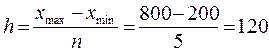 Сформируем интервалы группировки – (200 – 320); (320 – 440); (440 – 560); (560 – 680); (680 – 800). Для построения самой группировки построим рабочую таблицу 2. Таблица 2