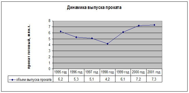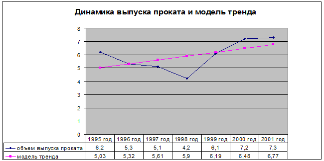 Вывод: за весь период (1995-2001 гг.) выпуск проката увеличился на 1,1 млн. т. или на 17,74 %. При этом выпуск проката возрастал в 1999-2001 гг. на 3,1 млн. т. или на 64,66 % и снижался 1996-1998 гг. на 2 млн. т. или на 64,52 %.