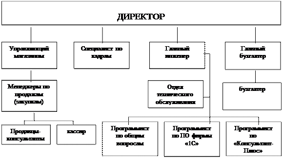 Рисунок 5 – Организационная структура управления фирмы ЗАО «ХХХ» Данную организационную структуру можно отнести к линейно-функциональной структуре управления. Плюсом данной формы управления является качественное разделение труда в управлении, при котором линейные руководители сохранили за собой право отдавать распоряжение и принимать решения при участии и помощи функциональных работников. Минусом в такой организационной структуре управления является постоянная необходимость в согласовании принимаемых решений, что вызывается решением производственных задач, обусловленных новыми целями функционирования и требующих определенных знаний. Это приводит к замедлению сроков реализации товара, что ведет к росту управленческих расходов. Миссия ЗАО «ХХХ» состоит в обеспечении предприятий, организаций и населения компьютерной, орг-, и другими видами современной техники, а также предоставлением качественных услуг в сфере компьютерных технологий. Благодаря эффективности и бесперебойности функционирования подобных учреждений, зависит не только успех деятельности отдельных хозяйственных единиц, но и темпы экономического и научно-технического развития страны в целом. Что же касается ЗАО «ХХХ», то следует отметить, что он имеет некоторую отраслевую направленность. Все большее количество предприятий и организаций обслуживает сейчас «ХХХ» – это частные, муниципальные и другие организации, а также, что особенно приятно, частные лица. В соответствии с этим и определяется его миссия - содействовать экономическому и научно-техническому развитию и благосостоянию предприятий и организаций, обслуживаемых ЗАО «ХХХ», путем предоставления им качественной и надежной продукции и предоставления услуг, таким образом и в таком объеме, которые соответствуют высоким профессиональным стандартам. Сотрудники фирмы всегда придерживаются негласного правила: «Клиент всегда прав!». Общие положения из устава фирмы: - закрытое акционерное общество «ХХХ» учреждено Комитетом по управлению имуществом г. Омска - закрытое акционерное общество несет ответственность за результаты своей деятельности, за выполнение взятых на себя обязательств перед акционерами и партнерами по заключенным договорам, а также перед трудовым коллективом, согласно действующему законодательству - организация получает право юридического лица после ее государственной регистрации, вправе от ее имени заключать договоры, приобретать имущественные и не имущественные права, нести обязанности, быть истцом и ответчиком в судебных органах - организация отвечает по своим обязательствам имуществом предприятия - организация руководствуется в своей деятельности законодательством Российской Федерации, нормативными актами, регулирующую предпринимательскую деятельность - организация имеет собственный баланс, расчетный и иные счета в банках, бланки, угловой штамп, товарный знак, печать со своим наименованием [1]. Кратко миссию ЗАО «СКЦ» можно изложить всего несколькими словами, которые произнес Билл Гейтс: «Компьютер на каждом столе!». На основе общей миссии формулируются и устанавливаются цели предприятия - конкретные конечные состояния или желаемый результат, которого стремится достигнуть предприятие. Ниже перечислены приоритетные цели ЗАО «СКЦ»: - увеличение объема 
