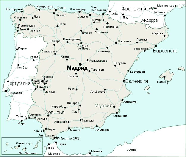 - країна з багатовіковою історією, що бачила епохи розквіту і занепаду декількох могутніх держав. Найбільш стародавні пам'ятники культури на території Іспанії відносяться до епохи палеоліту. Це наскальні малюнки на стінах печери Альтаміра недалеко від кантабрійського міста Сантильяна-дель-мари. Від архітектури іберів (стародавні племена, що населяли Піренейський півострів в I тисячолітті до н.е. ) залишилися руїни велетенських кам'яних стін в Таррагоне. Про римлян в Іспанії нагадують головним чином цивільні споруди - водопроводи, мости, акведуки, амфітеатри, арки. Чудово зберігся один з римських мостів - Алькантара на річці Тахо. Розділ 1 1.1. Географічне розташування Іспанії Іспанія Форма державного правління: конституційна монархія Столиця: Мадрид Площа:504 782 кв.км Населення: 39,4 млн осіб Мова: іспанська Грошова одиниця: євро Іспанія розташована на південному заході Європи. Велика частина Іспанії доводиться на Піренейський півострів (вона займає близько 75% його території). Іспанії належать також численні острови: Балеарські і Пітіузськіє в Середземному морі, а також Канарські - в Атлантичному океані. Міста Сеута і Мелілья, що знаходяться до Марокко, а також островів Велес де ла Гомера, Алусенас і Чафаранас знаходяться під управлінням Іспанії, маючи при цьому значну автономію. Загальна площа країни складає 504 750 кв. км., з них 499 400 кв. км. доводяться на сушу, а 5 350 кв. км. зайняті водою. Середня висота рівнем морить -660 м, що значно середньоєвропейського показника. Майже половина поверхні знаходиться на висоті від 600 до 1. 200 метрів над рівнем моря, і головні гірські вершини розташовані поблизу побережжя. Іспанія граничить з Францією (623 км. ), Португалією (1б214 км.), Андоррою (65 км.), англійською колонією Гібралтар (1,2 км.), Марокко (15,9). Загальна протяжність межі сухопутних кордонів складає 1919,1 км., протяжність берегової лінії - 4б964 км. Іспанія з усіх боків облямована горами. Найвищі розташовані на півночі і на півдні. На півночі Іспанії знаходиться гряда Пірінейськіх гір, що відокремлює півострів від Європи. Довга гряди - 440 км., середня висота гір - 2 000 м. На півдні уздовж побережжя протягнулися гори Сьєрра-Невада, де знаходиться найвища вершина півострова - пік Мулансен (3482 м. ). На території Піренейського півострова перетинаються численні гірські ланцюги і хребти, серед яких виділяються Кантабрійськіє гори, де знаходяться Списи Європи; Центральні Кордільєри з гірським масивом Гредос; Іберійські гори і Кордільєри Бетіки. У горах Іспанії дивно багата флора і фауна. Тут багато живописних льодовиків і гірських озер. Якщо гори займають в основному прибережні території, то весь центр Піренейського півострова займає величезне плоскогір'я - Месета. Месета є найбільшим плоскогір'ям в Європі. Цей регіон завжди був центром сільськогосподарського виробництва - тут і сьогодні в промислових масштабах вирощують виноград, оливки, пшеницю і ячмінь. На північному заході від плато Месета знаходиться побережжя Біськайського затоки і Атлантичного океану. Це вологий район, покритий зеленими лісами. Середземноморське побережжя Іспанії, розташоване на сході півострова, також облямоване гірською грядою. Воно є чергуванням піщаних долин (уздовж лагуни Валенсії і Малого моря в Мурсиі) і грізних обривистих скель (на Коста Брава), крутих берегів, що прорізають невели