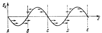 Рис. 1. К группировке электронов электрическим полем продольной составляющей замедленной бегущей волны. Распределение E z( z) показано при t=0. При точном синхронизме, когда скорость поступательного движения электронов вдоль оси z равна фазовой скорости волны в направлении движения электронов (u = u z), электроны неподвижны по отношению к полю бегущей волны, и обмена энергией между электронами и волной нет. При u > u z сгустки обгоняют волну, чему на рис. 1. соответствует движение слева направо, т. е. против тормозящей силы. При этом кинетическая энергия движения электронов переходит в энергию СВЧ поля. Следовательно, поле усиливается. Это усиление когерентно, и при соответствующей обратной связи возникает генерация. Как обычно, генерация начинается под действием флуктуационных толчков, в поле излучения которых все более интенсивно происходит образование электронных сгустков, в свою очередь все более интенсивно испускающих электромагнитное излучение. На языке квантовой электроники это и отвечает индуцированному излучению. Лампа бегущей волны представляет собой чрезвычайно широкополосную систему. В рассмотренном случае пространственный период формирования сгустков равен L = Т u z , где Т — временной период колебаний. При спиральной замедляющей системе u z = cd/2 p а и в первом приближении не зависит от частоты поля, т. е. дисперсия отсутствует. Условия синхронизма, определяющие частоту колебаний усиливаемого поля, в этом приближении зависят только от скорости электронов, т. е. от разности потенциалов электростатического поля, ускоряющего электроны, и не привязаны к какому-либо характерному собственному пространственному периоду замедляющей структуры, которая тогда может считаться однородной. В силу своей широкополосности лампы бегущей волны обычно используются для усиления слабых сигналов СВЧ. Устройства, применяемые для создания генераторов, обычно существенно более узкополосны. Для них характерно наличие пространственно-неоднородной периодической структуры, обладающей собственными резонансами, т. е. наличие существенно дисперсионной структуры Длина волны излученияРассмотрим электрон, пролетающий со скоростью V через некоторую пространственно-периодическую систему, характеризуемую пространственным периодом L . На электрон действует периодическая сила с временным периодом L / V . Следовательно, ускорение электрона меняется периодически с частотой V/ L. Этому соответствует движение по пространственно-периодической траектории. Движущийся по такой траектории электрон излучает. При существенно дорелятивистских скоростях частота излучения равна частоте периодического движения V/ L . Для макроскопических пространственных периодов L длина волны излучения нерелятивистском случае соответствует радиодиапазону. l = с L /V (1) Ситуация существенно изменяется при увеличении скорости электрона. Релятивистский эффект Доплера приводит к резкому уменьшению длины волны излучения по сравнению с характерными размерами излучающей системы. При скорости электрона, близкой к скорости света (V £ с), в силу релятивистского сокращения масштаба имеем L ' = L (1 — 2 /с 2) 1/2 , при этом частота периодического воздействия на электрон в сопутствующей электрону системе координат увеличивается до значения g V/ L , где релятивистский фактор g = (1 — V 2 /с 2) -1/2 . В 
