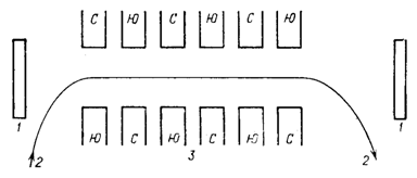 Рис. 2. Схема лазера на свободных электронах: 1 — зеркала, 2 — электронный пучок, 3 — магнитный ондулятор; С и Ю — северный и южный полюсы магнитов ондулятора. Если за время пролета пространства взаимодействия электронов с волной электронный пакет разойдется со световой волной меньше, чем на длину волны, нарушением синхронизма можно пренебречь. Правда существуют и слабо релятивистские приборы, подобные мазерам на циклотронном резонансе, разработанным под руководством А. В. Гапонова-Грехова, которые оказались весьма перспективными источниками коротковолнового СВЧ излучения большой мощности. С целью получения большой мощности при сравнительно низкой частоте генерации (СВЧ или дальний ИК диапазоны) обычно используются сильноточные пучки электронов не слишком высокой энергии. Продвижение в оптический диапазон требует применения электронных пучков большой энергии (см. формулу (2), которые вследствие этого обладают сравнительно низкой плотностью. В случае сильных токов существенную роль играют коллективные эффекты в плазме пучка, роль которых в создании условий для индуцированного излучения вкратце обсуждена в начале этой лекции. В случае слабых токов взаимодействие электронов с полем имеет существенно одночастичный характер. Имея в виду лазер на ультрарелятивистских электронах (g >>1), дальнейшее рассмотрение проведем в одночастичном приближении. Количественный критерий законности одночастичного подхода мы приведем в конце нашего рассмотрения. Теория ЛСЭ; ондуляторный лазер на свободных электронахВ ондуляторном лазере на свободных электронах релятивистский электронный пучок (обычно это последовательность коротких электронных пакетов) пролетает через достаточно протяженную область, в которой магнитное поле пространственно периодично (2). Систему, обеспечивающую пространственную периодичность поля, называют ондулятором (от французского onde — волна или ondulatoire — волнообразный, волнообразователь) или виглером (от английского wiggle — покачивать, извиваться). Магнитные ондуляторы создают вблизи оси пучка постоянное во времени поперечное пространственно-периодическое линейно или циркулярно поляризованное поле. Рассмотрим лазер со спиральным ондулятором, магнитное поле, на оси которого циркулярно поляризовано. При круговой поляризации волны, распространяющейся вдоль оси z параллельно электронному пучку, электроны находятся в полях, определяемых векторными потенциалами поля ондулятора A 1 и пола электромагнитной волны A 2, A 1 = A 2 = (5) Здесь x и у — единичные векторы вдоль осей Ох и Оу, перпендикулярных друг к другу и к оси Оz; Е — напряженность электрического поля; w — частота распространяющейся вдоль Ог электромагнитной волны; q = 2 p / L (L и Н — период и напряженность магнитного поля ондулятора). В системе координат, движущейся с первоначальной скоростью электронов V » c , потенциалы (5) принимают вид