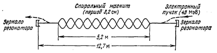 Рис. 4. Схема Станфордского лазера на свободных электронах в режиме генератора. Около зеркал, кроме поля ондулятора, использовалось ведущее поле для ввода и вывода электронного пучка. © 1977 APS