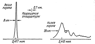 Рис. 6. Сужение спектральной линии излучения ЛСЭ выше и ниже порога генерации. © 1977 APS