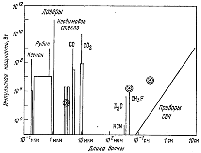 Рис. 10. Когерентные источники большой мощности; двойными кружками указаны ЛСЭ В области спектра, представляющей интерес для химиков (200 – 4000 см-1 ), наличие перестраиваемого по частоте источника позволило бы качественно повысить эффективность применения колебательной спектроскопии поглощения молекул. Длительность импульса ЛСЭ может быть меньше времени релаксации молекул; следовательно, можно с высокой точностью контролировать химические процессы с участием выделенных связей. Применение высокоэффективного ЛСЭ позволит нам не только лучше понять химические цепные реакции с лазерным возбуждением, когда фотодиссоциация одной молекулы будет приводить к образованию большого числа других, но и приблизит их к реализации в промышленных масштабах. В дальнем ИК-диапазоне (~100 мкм), где энергия фотонов равна примерно kt , ЛСЭ можно было бы использовать для исследования низкоэнергетических состояний Ван-дер-Ваальса. Возможность широкой перестройки частоты и высокая эффективность делают ЛСЭ весьма привлекательными для лазерного разделения и обогащения изотопов. Другим весьма полезным свойством некоторых ЛСЭ является возможность работы в режиме коротких импульсов (в случае применения для этих целей микротрона, линейного ускорителя или накопительного кольца). Короткие импульсы (рис. 11) длительностью несколько пикосекунд весьма эффективны для исследования различных видов возбуждений (рис. 12).