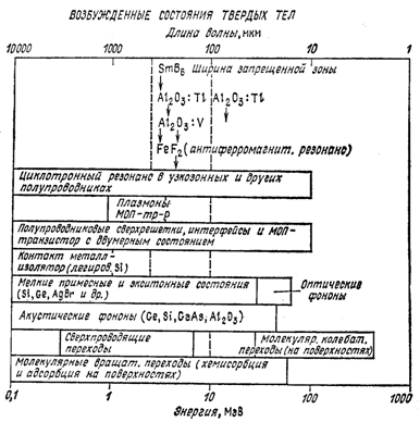 Рис. 12. Применения ЛСЭ в физике твердого тела. (Согласно Шоу и Пателу) До появления ЛСЭ источники излучения в дальнем ИК диапазоне и в субмиллиметровой области спектра имели низкий уровень мощности и не перекрывали весь диапазон, а приемники были весьма дорогими или имели невысокую чувствительность. Однако с помощью ЛСЭ в дальнем ИК диапазоне можно получить множество важных результатов в области физики твердого тела (рис. 13).