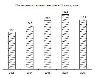 Лидером киноиндустрии по объему инвестиций в России остается рынок телесериалов и телефильмов (объем инвестиций за последние 4 года составил 38 млрд руб., при этом было произведено более 10 500 эпизодов телесериалов и более 450 телефильмов. Однако в 2009 году проявилась нехарактерная для рынка тенденция: число производимых кинофильмов превысило число телефильмов, поскольку телевидение оказалось более подвержено воздействию финансово-экономического кризиса по причине меньшей продолжительности производственного цикла и большей чувствительности к заказам на запуск производства со стороны телеканалов. Современный этап развития кинорынка в России характеризуется доминированием крупных игроков над более мелкими независимыми участниками рынка. Способность оказывать давление, имея в своем распоряжении сильный пакет фильмов или широкую сеть кинозалов, дает возможность крупным компаниям не принимать в расчет мнения своих менее влиятельных контрагентов. В период с 2006 по 2009 гг. число посещений кинозалов росло, однако в 2010 сократилось на 10,13% по сравнению с предыдущим годом.