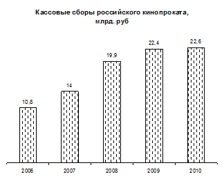 Кассовые сборы российского кинопроката также растут. При этом прирост количества сборов в 2007 году относительно показателей прошлого года составил 29,63%. В 2008 г. -42,14%. В 2009 - 12,56%. А в 2010 г - 0,89%. В то же время основным фактором роста валовых сборов в России в последние годы оставалось удорожание средней цены кинопосещения как в рублевом, так и в долларовом эквиваленте (за исключением 2009 года, когда из-за девальвации рубля средняя цена в долларах снизилась на 21% и достигла уровня в 5,3 USD, почти не изменившись в рублевом эквиваленте – 171 руб).