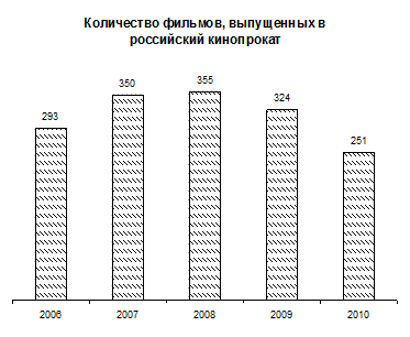 В 2006 – 2008 гг. на экраны российских кинозалов выходило все большое количество кинофильмов. Но в 2009 году картина изменилась. Стала проявляться тенденция к снижению количества фильмов в кинопрокате. Так в 2009 году количество фильмов составило 324, а в 2010 году – 251 фильм.