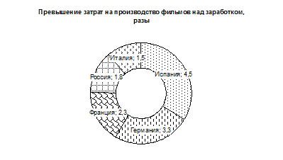 В рейтинге ведущих российских сетей лидирующие позиции стабильно занимают десять компаний, среди которых крупнейшие федеральные киносети «Каро Фильм» (удерживает лидерство с 2005 года), «Синема Парк», «Киномакс», «Кронверк Синема», «KinoStar», «Люксор»,«Парадиз», «Монитор», региональная сеть «Премьер-зал» и местная «Формула кино». На долю десяти крупнейших киносетей приходится 38% рынка современных кинозалов России. Сравнение окупаемости российских фильмов США и со странами Европы Что касается такого важного показателя, как окупаемость, то дела в России обстоят даже лучше, чем в Европейских странах. Если брать Западную Европу, то хуже всего национальные фильмы окупаются в Испании. В прокате на своем рынке испанские продюсеры зарабатывают почти в 4,5 раза меньше, чем тратят на съемки. В Германии доходы от проката местных фильмов в 3,3 раза меньше, чем затраты на производство, во Франции— в 2,3 раза, в России— в 1,8 раза, в Италии— в 1,5.