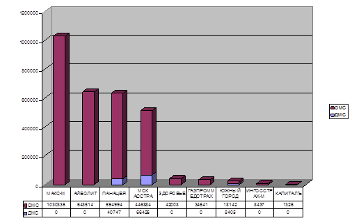 Рис. 2.2 Страховые выплаты, произведенные медицинскими страховыми компаниями, работающими на территории Ростовской области в январе-июне 2006 г., тыс. руб. Из рис. 2.1 и рис. 2.2 видно, что МСК «АсСтра» занимает 4 место на страховом рынке Ростовской области по ОМС и является лидером по ДМС. Доля предприятия по собранным страховым взносам за данный период составила 17,48% страхового рынка (по ДМС – 57,47%). На базе МСК «АсСтра» создан Институт Семейных врачей и Центр семейной медицины. Так же создана собственная круглосуточная служба неотложной помощи и круглосуточная диспетчерская служба. Для удобства обслуживания застрахованных в МСК «АсСтра» создан медикаментозный фонд и открыта аптека «АССТРА-LTD», которая расположена на территории РГМУ. Лечебными базами МСК АсСтра являются следующие ЛПУ: Ростовский государственный медицинский университет (клиники РостГМУ), Областной Консультативно Диагностический Центр, МЛПУ «Диагностический центр», Дорожная больница СКЖД, Областная больница №2, Городская больница №20, Поликлиника №10. Также заключено 200 договоров с лечебно-профилактическими учреждениями г. Ростова-на-Дону и области. Компания обладает развитой филиальной сетью в Ростовской области. Десять филиалов занимается обязательным медицинским страхованием: · Новочеркасский филиал; · Матвеево-Курганский филиал; · Егорлыкский филиал; · Багаевский филиал; · Цимлянский филиал; · Тарасовский филиал; · Зерноградский филиал; · Чертковский филиал; · Таганрогский филиал; · Кагальницкий филиал. Два филиала – Новочеркасский и Таганрогский, осуществляют добровольное медицинское страхование. Структура центрального офиса компании представлена на рис. 2.1.