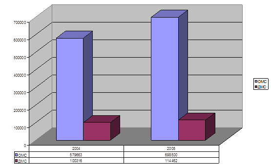 Рис. 2.4 Динамика страховых сборов МСК «АсСтра» по ОМС и ДМС в 2004–2005, тыс. руб.