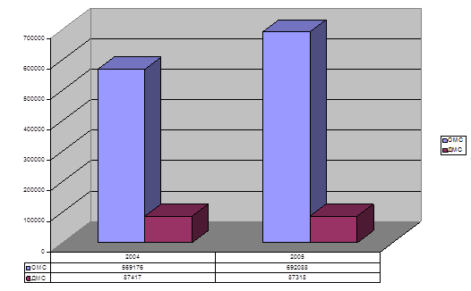 Рис. 2.3 Страховые премии и страховые выплаты МСК «АсСтра» в 2004–2005 гг., тыс. руб. В МСК «АсСтра» в целом в 2005 году наблюдался рост портфеля, как по количеству договоров, так и по объемам собранных премий. Значительную долю договоров компании составляют договоры по ОМС (рис 2.4 и 2.5).