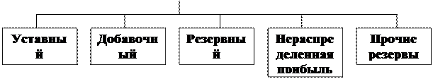 Рис. 1 Состав собственного капитала коммерческой организацииУставный капитал организации - это стартовый капитал, необходимый для осуществления финансово - хозяйственной деятельности предприятия. Согласно ГК РФ уставный капитал может выступать в виде: складочного капитала, паевого либо неделимого фонда, уставного капитала, уставного фонда. Уставный капитал акционерного общества составляется из номинальной стоимости акций общества, приобретенных акционерами. Уставный капитал общества определяет минимальный размер имущества общества, гарантирующего интересы его кредиторов. Он не может быть менее размера, предусмотренного законом об акционерных обществах, и должен составлять для открытого акционерного общества не менее тысячекратной суммы минимального размера оплаты труда, установленного федеральным законом на дату регистрации общества, а закрытого общества – не менее стократной суммы минимального размера оплаты труда, установленного федеральным законом на дату государственной регистрации общества. (1 МРОТ равен 100р.) Открытая подписка на акции акционерного общества не допускается до полной оплаты уставного капитала. При учреждении акционерного общества все его акции должны быть распределены среди учредителей. Законом или уставом общества могут быть установлены ограничения числа, суммарной номинальной стоимости акций или максимального числа голосов, принадлежащих одному акционеру. Акционерное общество вправе по решению общего собрания акционеров увеличить уставный капитал путем увеличения номинальной стоимости акций или выпуска дополнительных акций. Увеличение уставного капитала акционерного общества допускается после его полной оплаты. Увеличение уставного капитала общества для покрытия понесенных им убытков не допускается. В случаях, предусмотренных законом об акционерных обществах, уставом общества может быть установлено преимущественное право акционеров, владеющих простыми (обыкновенными) или иными голосующими акциями, на покупку дополнительно выпускаемых обществом акций. Акционерное общество вправе по решению общего собрания акционеров уменьшить уставный капитал путем уменьшения номинальной стоимости акций либо путем покупки части акций в целях сокращения их общего количества. Уменьшение уставного капитала общества допускается после уведомления всех его кредиторов в порядке, определяемом законом об акционерных обществах. При этом кредиторы общества вправе потребовать досрочного прекращения или исполнения соответствующих обязательств общества и возмещения им убытков. Уменьшение уставного капитала акционерного общества путем покупки и погашения части акций допускается, если такая возможность предусмотрена в уставе общества. Стоимость чистых активов акционерного общества оценивается по данным бухгалтерского учета в порядке, устанавливаемом Министерством финансов Российской Федерации и федеральным органом исполнительной власти по рынку ценных бумаг. Если по окончании второго и каждого последующего финансового года в соответствии с годовым бухгалтерским балансом, предложенным для утверждения акционерам общества, или результатами аудиторской проверки стоимость чистых активов общества оказывается меньше его уставного капитала, общество обязано объявить об умень