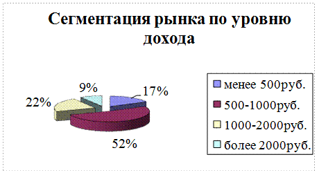 Сегментация рынка будет проводиться по уровню доходов за рабочую неделю (см. Рисунок 1)и по возрасту (см. Рисунок 2). Потенциальную емкость рынка можно определить следующим образом: Рисунок 1. «Сегментация рынка по уровню дохода». Рисунок 2. «Сегментация рынка по возрасту».