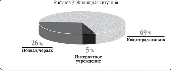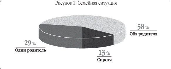 Среди уличных подростков и молодежи Санкт-Петербурга в возрасте 15–19 лет только 13,4% являются сиротами, т. е. не имеют обоих родителей (рис. 2). Более чем у половины (57,5%) есть либо оба родителя, либо один родной родитель и мачеха или отчим, и одна треть (29,1%) воспитывается в неполных семьях. Около 11% подростков сохраняют постоянный контакт с семьей, живут и регулярно ночуют дома, и лишь часть времени проводят в уличной «тусовке». При этом у 56,6% семей имеются проблемы с алкогольной или наркотической зависимостью родителей или других близких родственников, а в 27,8% один или оба родителя не работают. [31].