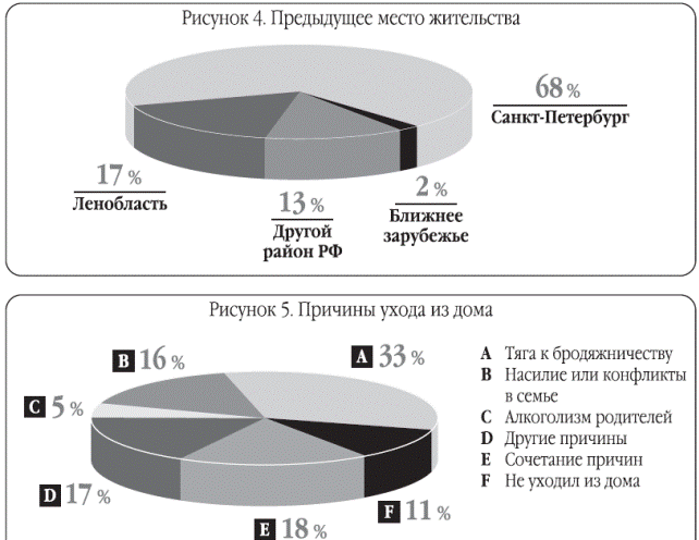 Почти 70,4% уличной молодежи проживают в квартирах или комнатах, необязательно со своими родителями, но зачастую с друзьями и подругами группами по несколько человек. Тем не менее, каждый четвертый (23,5%) не имеет места для жилья и проживает в подвале, на чердаке, или в приспособленном нежилом помещении. Еще 6,2% проживают в государственном учреждении (детском доме, интернате) или в общежитии (см. рис. 3). При этом 71,3% безнадзорных имеют регистрацию по месту жительства в Санкт-Петербурге. Практически все эти подростки (68,4%) родились и всегда проживали в Санкт-Петербурге, еще 16,8% приехали из Ленинградской области, 13,6% – из других регионов России, а 1,3% – из ближайшего зарубежья (см. рис. 4). Около 6,4% уличной молодежи живут в Санкт-Петербурге менее 1 года, а 8,0% мигрируют сюда в зависимости от сезона. [31].