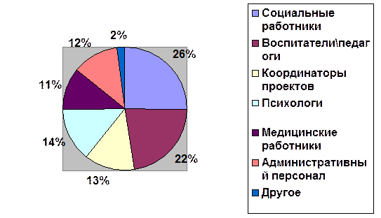 Рис. 8. Профессиональное распределение сотрудников «Врачи детям» ПРОЕКТЫ [54]: • Центры социально-медицинской помощи детям улиц • Помощь ВИЧ-инфицированным детям улиц • Социальная квартира для подростков • Приемная семья • Социально-медико-психологический патронаж семей группы риска • Центр «МАМА+» Достижения организации в 2007-2008 гг. • Всего 1441 детей и семей получили помощь организации в течение двух лет, в том числе 212 детей и семей, затронутых проблемой ВИЧ-инфекции. • 640 уличных детей и подростков получили медицинскую, социальную и психологическую помощь. • 82 беспризорных и безнадзорных ребенка возвращены в семью или помещены в приют для дальнейшего жизнеустройства, и еще 6 детей возвращены в семью из интернатного учреждения. • 70 детей избежали изъятия из семьи и остались со своими родителями; • 122 уличных подростка прошли добровольное консультирование и тестирование на ВИЧ; 26 ВИЧ-положительных подростков обследованы и поставлены на учет в Центре СПИДа. • Для 71 ребенка из приютов были найдены новые семьи. • 163 детям, рожденным ВИЧ-положительными женщинами, мы помогли сохранить семейную поддержку, а 10 детей вернули в семьи из интернатных учреждений. • Завершен ремонт и оснащение социальной квартиры для подростков 15–18 лет, которая в 2007 году приняла своих первых жильцов. Организацией оказывается психолого-педагогическая помощь: - психодиагностика, индивидуальное и семейное консультирование детей и родителей; - групповое консультирование и тренинги; - помощь в обучении по программе средней школы; - организация полезного досуга. Медицинская помощь: - медицинский осмотр; - направление в медицинские учреждения; - первая медицинская помощь; - санитарно-гигиеническая помощь; - профилактика ВИЧ, ИППП и других заболеваний. Социальная помощь: - социально-юридическое консультирование; - материальная помощь; - помощь в оформлении документов и пособий. В 2008 году Центры СМП предоставили медицинскую, психологическую и социальную помощь 382 детям и подросткам, которые совершили 2461 посещение в Центры. В 2008 году помощь получили 433 клиента (из них 258 новых), которые совершили 5094 посещения. Таким образом, всего в 2007–2008 гг. помощь была оказана 640 уличным детям и подросткам. Однако главный успех работы Центров СМП – это возвращение 82 детей и подростков в семью или помещение в приют для дальнейшего жизнеустройства. [54].