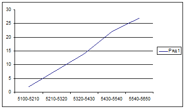 Данная группировка не удовлетворяет закону нормального распределения, поэтому необходимо провести вторичную группировку, изменив при этом величину интервала с 90 до 110. Таблица 1.2 Вторичная группировка