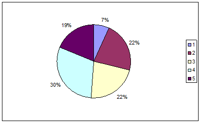 Условные обозначения: х - стаж по специальности; f- накопленная частота. Графики являются важным средством выражения и анализа статистических данных, поскольку наглядное представление облегчает восприятие информации. Графики позволяют мгновенно охватить и осмыслить совокупность показателей - выявить наиболее типичные соотношения и связи этих показателей, определить тенденции развития охарактеризовать структуру и т.д. Секторная диаграмма представляет собой графическое изображение статистических данных при помощи секторов круга. При построении секторной диаграммы круг принимается за целое (100%) и разбивается на секторы, дуги которых пропорциональны значениям отдельных частей изображающих величин. в) Используя данные Таблицы 2.1, построим секторную диаграмму для первого признака. Рисунок 5. Структура распределения предприятий по уровню объема продаж