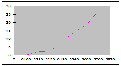 Условные обозначения: х - номер интервала; f- частота встречаемости признака б) Преобразованной формой вариационного ряда является ряд накопленных частот. Это ряд значений числа единиц совокупности с меньшими и равными нижней границе соответствующего интервала значениям признака. Такой ряд называется кумулятивным. Можно построить кумулятивное распределение "не меньше, чем", в этом случае график называется кумулятой. Построим кумуляту для объема продаж. Для этого необходимо найти кумулятивные ряды накопленных частот (Таблица 3.1). Таблица 3.1. Кумулятивные ряды накопленных частот для объема продаж
