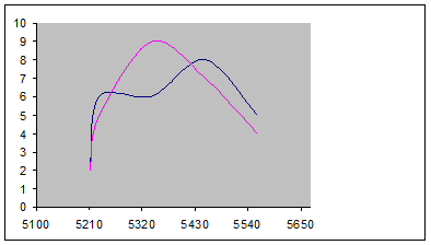 Условные обозначения: х - год; у - значения прироста 1 - темп прироста цепной; 2 - темп прироста базисный. На графике наглядно показаны приросты основных фондов, цепных и базисных. Причем видно, что после подъема темпы прироста начали быстро снижаться. Произведем аналитическое выравнивание показателей ряда динамики. Аналитическое выравнивание применяется для выявления тенденции. Выбор линии для аналитического выравнивания производится на основе построения графика или предварительных расчетов. Выберем показательную прямую: