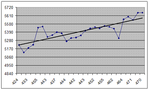 где ![]() Составим уравнение регрессии: y=5207+13,7х Средняя линия представлена на рисунке 9.1. Рассчитаем коэффициент эластичности. Он показывает, на сколько процентов изменится в среднем результативный признак y при изменении факторного признака x на 1%. Этот коэффициент рассчитываться по формуле: