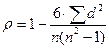 Ранг - это порядковый номер, присеваемый каждому индивидуальному значению х и у (отдельно) в ранжированном ряду. Оба признака необходимо ранжировать в одном и том же порядке: от меньших значений к большим и наоборот. Если встречается несколько одинаковых значений признака, то каждому из них присваивается ранг, равный частному от деления суммы рангов (мест в ряду), приходящихся на эти значения, на число равных значений. Коэффициент корреляции рангов Спирмена: