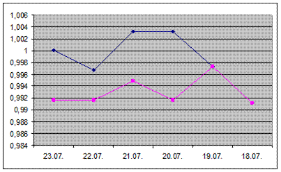 Подставив значения в формулу, подсчитаем курс валюты на 06.04.2003 г.: Р= 4,08407*1,00326=4,09738, Р=4,09738*1,00326=4,11074 Остальные уровни цен рассчитываются аналогично. Результаты расчетов поместим в таблице 1.2 (она представляет собой дополненную таблицу 3.1) Таблица 3.2 Курсы валют с 16.07.2003 г. по 23.07.2003 г.