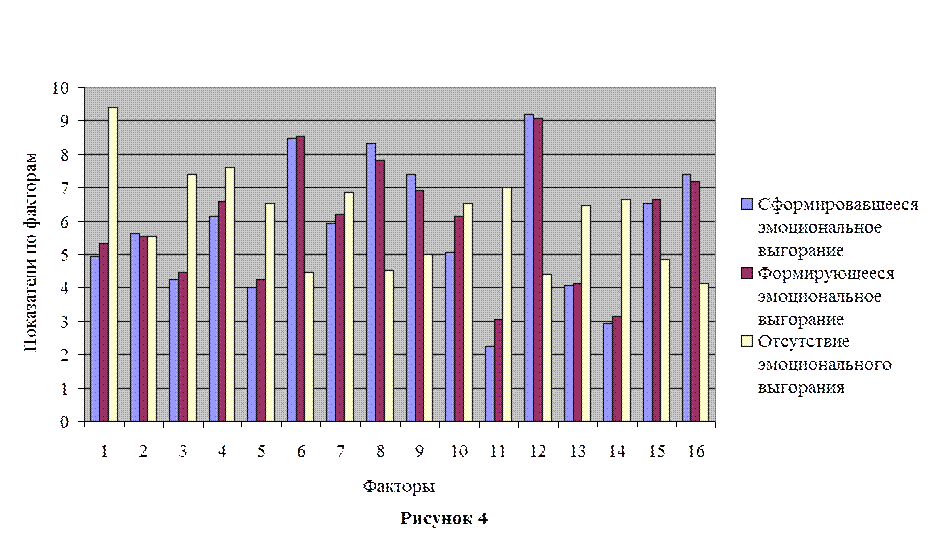 В группе педагогов с отсутствием эмоционального выгорания ведущий тип темперамента – сангвиник: повышенная реактивность, но при этом активность и реактивность уравновешены, присущи быстрота движений, гибкость ума, быстрое включение в новую деятельность, высокая пластичность проявляется в изменчивости интересов, экстраверт (хорошая приспосабливаемость к среде, направленность на окружающие события), открытость в чувствах, уверенность в себе, стремление к лидерству (см. Рис.3.). В группе педагогов с формирующимся эмоциональным выгоранием ведущий тип темперамента – флегматик: высокая активность преобладает над малой реактивностью, работоспособность, с трудом переключает внимание, интровертированность (направленность на свой внутренний мир, плохо приспосабливается к новой обстановке), косность стереотипов, постоянство интересов, инертность, обязательность, высокий самоконтроль, сдержанность, рассудительность (см. Рис.2.). Ведущий тип темперамента в группе педагогов со сформировавшимся эмоциональным выгоранием – меланхолик: малая реактивность, неуверенность в себе, мимика и движения не выразительны, обязательность, высокий самоконтроль, пессимистичность, интровертированность (направленность на свой внутренний мир, трудность в адаптации к реальности), замкнутость, чувствительность, нерешительность, тревожность, ригидность, изменчивость настроения (см. Рис.1.). В ходе исследования с помощью коэффициента многоклеточной сопряжённости Пирсона выявлена зависимость между уровнем сформированности эмоционального выгорания у педагогов в профессиональной деятельности и доминирующим типом темперамента χ²=15,165; С≈0,502 (р≤0,05). Таким образом, можно предположить, что такие свойства темперамента как пластичность, экстравертированность (хорошая приспосабливаемость к среде, направленность на окружающие события), открытость в чувствах, уверенность в себе, стремление к лидерству – препятствуют формированию эмоционального выгорания у педагогов в процессе выполнения профессиональной деятельности. Выводы по главе 3.: 1.Результатом проведённого исследования по тесту Кеттелла и методике цветовых выборов Люшера можно назвать выделение следующих личностных качеств, являющихся предрасполагающими факторами формирования эмоционального выгорания у педагогов в процессе выполнения профессиональной деятельности: консервативности как особенности интеллекта; эмоционально-волевых особенностей – эмоциональной неустойчивости, низкого уровня стрессоустойчивости, низкой самооценки, склонности к чувству вины, чувствительности к замечаниям, повышенного самоконтроля, высокого уровня тревожности, эмоциональности; особенностей отношения к делу и социальным нормам – строгое следование нормам, обязательность, ответственность, дисциплинированность, высокую совестливость, социальную напряжённость; особенностей отношения к людям – подозрительность, раздражительность, высокомерие, ревнивость, завистливость, прямолинейность; особенностей отношения к групповым нормам – зависимость от мнения других. 2.Основываясь на полученных результатах по методике «Оценка темперамента» А. Белова и выявленной в ходе исследования зависимости между уровнем сформированности эмоционального выгорания у педагогов в процессе выполнения профессиональ