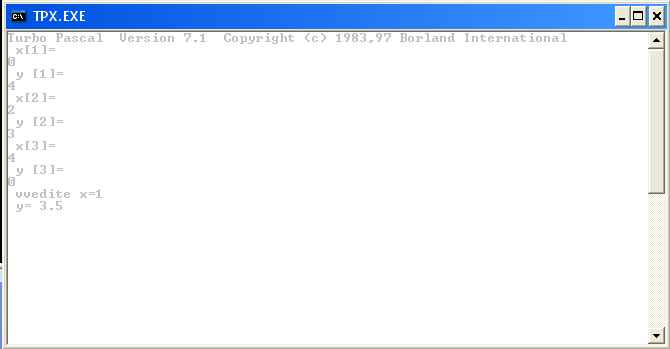 Program interpol2; Const N=3; Var x: array [1..N] of real; y: array [1..N] of real; a, b, c, xр, yр, deltaA, deltaB, deltaC, delta : real; i: integer; begin for i:=1 to N do begin{ввод данных через массивы } writeln (‘x[‘,I,’]=’); readln (x[i]); writeln (‘y[‘,I,’]=’); readln (y[i]); end; write (‘vvedite x’); { ввод промежуточного значения } readln (xр); for i:=2 to N do if (x[i-1]<=xр) and (xр<=x[i-1]) then begin{вычисления} delta:= x[i-1]*x[i-1]*x[i] – x[i-1]*x[i-1]*x[i+1]+ x[i-1]*x[i+1]*x[i+1] – x[i-1]*x[i]*x[i] – x[i+1]*x[i+1]*x[i]+ x[i+1]*x[i]*x[i]; deltaA:= x[i+1]*y[i]– x[i-1]*y[i] +y[i-1]*x[i]-x[i+1]*y[i-1] – y[i+1]*x[i]+x[i-1]*y[i+1]; deltaB:=x[i-1]*x[i-1]*y[i] – x[i+1]*x[i+1]*y[i]- y[i-1]*x[i]*x[i] + y[i+1]*x[i]*x[i] – x[i-1]*x[i-1]*y[i+1] + x[i+1]*x[i+1]*y[i-1]; deltaC:= y[i+1]*x[i-1]*x[i-1]*x[i] – y[i]*x[i-1]*x[i-1]*x[i+1] + y[i]*x[i-1]*x[i+1]*x[i+1]- y[i+1]*x[i-1]*x[i]*x[i] –y[i-1]*x[i+1]*x[i+1]*x[i] + y[i-1]*x[i+1]*x[i]*x[i]; a:= delta/deltaA; b:=delta/deltaB; c:= delta/ deltaC; yр:= a*xр*xр + b*xр +c; end; writeln (‘y=’, yр); {вывод искомого значения} readln; end. Пример . Найти приближенное значение функции y = f ( x) при x = 2.5, если известна следующая таблица её значений:
