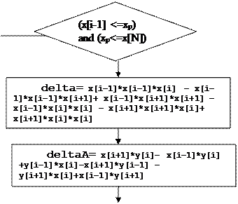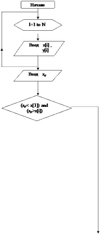 Следовательно, при использовании линейной интерполяции сначала нужно определить интервал, в который попадает значение аргумента х , а затем подставить его в формулу (1) и найти приближенное значение функции в этой точке. Данный алгоритм представлен на рисунке