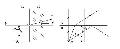 Рисунок 4, 5- Переломлення променя на межі двох середовищ Явище повного внутрішнього відображення широко використовується при створенні різних оптичних деталей, наприклад, відбивних призм, світловодів і т.п. Варто помітити, що закон відображення може бути представлений як окремий випадок закону переломлення за умови n' = -n, тоді sin e = -sin e' чи e = -e'. 3 Переломлення променів плоскою і сферичною поверхнями Розглянемо переломлення променя плоскою границею розділення двох середовищ за умови, що n < n' (рис. 6). Відповідно до закону переломлення sin e' = (n/n'} sin e. (3) Тоді як e = s і e' = s', то sin s' - (n/n') sin s. З рис. 6 випливає, що s tg s = s' tg s', отже, s' = s tg s/tg s'. Відрізок s і кут s визначають положення предметної точки А, а відрізок s' і кут s' — відповідно положення точки А' — зображення цієї точки При s = 0 кут s'= 0, тобто промені, перпендикулярні до плоскої поверхні, проходять крізь неї без зміни напрямку. Припустимо, що з точки А виходить гомоцентричний пучок променів. Чи зберігається гомоцентричність цього пучка при переломленні його плоскою поверхнею? З рис. 6 випливає, що sin s=sin e= sin Підставляючи ці значення синусів у формулу (3), одержимо