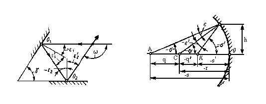 s' = r - q'. (7) Відрізок s' і кут s ' визначають положення зображення А' предметної точки А . З формул (7) видно, що відрізок s' є нелінійною функцією кута s , отже, сферична поверхня, що відбиває, порушує гомоцентричність пучка променів після його відображення. Значення кута s ' і відрізка s' для даної поверхні є вихідними для розрахунку ходу променів крізь наступну, що відбиває або переломлює поверхню складної системи. Розглянемо систему, що включає дві поверхні, що відбивають, 1 і 2. У цьому випадку s2 = s1 ¢ , а s2 = s1 ¢ - d1 . При розгляді декількох поверхонь, що відбивають, відстань між їхніми вершинами вважається позитивною, якщо наступна поверхня розташована праворуч від попередньої, і негативним - якщо ліворуч. Якщо предметна точка А знаходиться в нескінченності, то s1 = -¥ і кут s1 = 0. Тоді для визначення e1 у формулах (7) задають висоту h1 падіння променя, паралельного оптичній осі, на першу поверхню й обчислюють за формулою sin e1 = -sin j1 = -h1 /r1 . Прийняті раніше правила знаків дають можливість представити оптичні системи, що складаються з деталей із заломлюючими і поверхнями, що відбивають, через їхні конструктивні параметри (радіуси кривизни, товщину, показники переломлення, вид асферичних поверхонь). |