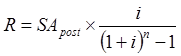 где SApre - будущая стоимость аннуитета, осуществляемого на условиях предварительных платежей (пренумерадо), R – член аннуитета, характеризующий размер отдельного платежа. 2) При расчете будущей стоимости аннуитета, осуществляемого на условиях последующих платежей (постнумерадо), используется формула