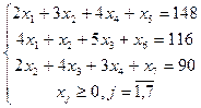 Строим симплексную таблицу. В качестве базисных неизвестных могут быть приняты неизвестные х5 , х6 , х7 , так как каждый из них входит только в одно уравнение системы и не входит в другие уравнения. Приравняв к нулю свободные переменные х1 , х2 , х3 , х4 , получаем базисное неотрицательное решение: х1 =0, х2 =0, х3 =0, х4 =0, х5 =148, х6 =116, х7 =90