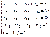 количество груза, планируемого к перевозке от i-го поставщика ( Общий объем производства åа i = 80+50+35= 170 меньше , требуется всем потребителям åbi = 30+55+44+42=171. Таким образом, имеет место дисбаланс между запасами и запросами. В математическом плане это означает, что наша задача – это задача открытого типа. Для устранения дисбаланса (приведения задачи к закрытому типу), введем фиктивный пункт производства с объемом производства, равным указанному дисбалансу т.е. Четырьмя условиями того, что из каждого пункта хранения вывозится весь продукт, являются: