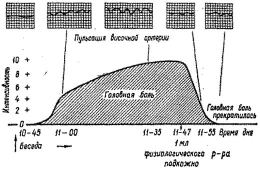 Малюнок 1. 3. Напад головного болю, викликаний хвилюванням і припинений за допомогою плацебо (за Вольфом) [27]. Змістовний аналіз цієї реакції вимагає вивчення конкретної життєвої історії людини, особливостей її особистостi, відносин до навколишньої дійсності, що сформувалися, її відношення до болю. Виходячи з вищевикладеного відзначимо, що аналіз психосоматичної проблеми болю дозволяє здійснювати бiльш адекватніше, з урахуванням їх складності і реальних технічних можливостей, планування і проведення конкретних досліджень. Перспективним залишається вивчення біологічних, психологічних і соціальних аспектів проблеми з реалізацією системного підходу до її рішення [57]. Прогрес в області психосоматичної медицини вимагає ухвалення основного постулату: психологічні чинники, якi впливають на фізіологічні процеси, що грають роль у виникненні хронічних болів, повинні піддаватися настільки ж докладному і ретельному вивченню, як це прийнято при дослідженні фізіологічних процесів. Згадка про емоції в таких термінах, як тривога, напруженість, емоційна нестійкість, є застарілою. Актуальний психологічний зміст емоції повинен бути досліджений найбільш передовими методами динамічної психології і мати кореляцію з соматичними реакціями. Інший постулат, який характеризує вищевикладене, полягає в тому, що психологічні процеси в своїй основі не відрізняються від інших процесів, котрi мають місце в організмі. Вони в той же час є фізіологічними процесами і відрізняються від решти тілесних процесів тільки тим, що сприймаються суб'єктивно і можуть бути передані вербально оточуючим. Тому вони можуть тому вивчатися психологічними методами. Кожен тілесний процес прямо або побічно схильний до впливу психологічних стимулів, оскільки організм в цілому є одиницею, всі частини якої взаємозв'язані між собою [55]. 1.3 Емоційні чинники болю при різних захворюваннях Психосоматичний погляд на медицину має на увазі новий підхід до дослідження причин хвороб з хронічним болем. Вивчення невротиків з позицій психоаналізу виявило, що під впливом тривалих емоційних розладів можуть розвиватися хронічні соматичні розлади з хворобливими відчуттями. Подібні соматичні зміни під впливом емоцій вперше спостерігалися у істериків [28]. Одне з найважливіших відкриттів Фрейда полягало в тому, що, коли емоція не може бути виражена і знята через нормальні канали за допомогою довільної активності, вона може стати джерелом хронічних психічних і соматичних порушень. Всяк випадок, коли емоції пригнічуються внаслідок психічних конфліктів, тобто виключаються з поля свідомості і таким чином позбавляються адекватної розрядки, вони стають джерелом хронічної напруги, що є причиною істеричної симптоматики. При істерії, проте, що мотивує психологічний імпульс, є неусвідомленим. Коли ми когось ударяємо або кудись йдемо, наші руки і ноги приходять в рух під впливом свідомих мотивацій і цілей. Так звані експресивні рухи: сміх, плач, міміка, жестикуляція — засновані на простих фізіологічних процесах. Є також абсолютно інша група психогенних соматичних розладів, що зачіпають внутрішні органи. Поняття функціонального розладу виникло не в психіатрії, а в галузі внутрішніх хвороб. Спочатку невротичні (або функціональні) розлади шлунку, кишкiвника і серцево-судинної системи стали в