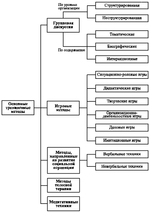 Малюнок 3.1. Основнi методи, використовувані в психотренінгу Вербальні методи базуються на вербальній комунікації та направлені переважно на аналіз вербального матеріалу. Невербальні методи спираються на невербальну активність, невербальну комунікацію і концентруються на аналізі невербальної продукції. Кожен психотерапевтичний метод в рамках групової психотерапії, незалежно від того, вербальний він чи невербальний, може зачіпати і когнітивну, і емоційну, і поведінкову сферу пацієнта [27]. Групова дискусія є основним, опорним методом психотерапії. Разом з цим терміном уживаються такі поняття, як вільна дискусія, спонтанна дискусія, неструктурована дискусія та ін. Всі ці назви підкреслюють спонтанний, жорстко не структурований характер ведення групи, недирективність поведінки психотерапевта. Таким чином, визначається три основні типи орієнтації групової дискусії: біографічна, тематична і інтеракційна. У різних напрямах групової психотерапії ці орієнтації мають різну питому вагу. Проте як ведучій практично завжди розглядається інтеракційна орієнтація, оскільки саме вона визначає специфіку групової психотерапії як методу, заснованого на використанні його при хронічних болях в лікувальній, психотерапевтичній меті групової динаміки, забезпечуючи реалізацію одного з найважливіших чинників лікувальної дії в рамках цього методу - зворотного зв'язку. Інтеракційна орієнтація направлена на аналіз особливостей міжособистiсної взаємодії в групі і ситуацій, що виникають в ході групового процесу. Біографічна орієнтація є обговоренням історії життя пацієнта, окремих епізодів і подій його біографії, його проблем, конфліктів, відносин, установок, особливостей поведінки впродовж життя. Тематична орієнтація концентрує увагу групи на актуальних для більшості учасників групи темах. Можна виділити опорні точки групової дискусії, її основні змістовні моменти. Це: · знайомство членів групи; · обговорення очікувань пацієнтів, їх страхів і побоювань, їх переживань у зв'язку з початком роботи групи і взаємодії з іншими її учасниками; · переживання і обговорення групової напруги, пов'язаної з розузгодженням між очікуваннями пацієнтів і груповою реальністю, поведінкою психотерапевта і тим, що відбувається в групі; · наростання опору і агресії відносно психотерапевта, співвідношення цих переживань з минулим життєвим досвідом; · розтин дійсних відчуттів до психотерапевта, їх усвідомлення, розуміння їх причин і переробка, вироблення групових норм відносно психотерапевта; · розтин проблем, пов'язаних з самостійністю, відповідальністю і активністю, відношення до авторитетів; · формування адекватного відношення до хвороби і лікування, активної мотивації до участі в роботі групи; · вироблення психотерапевтичних групових норм і групової культури, ухвалення її учасниками групи; · домінування інтеракцiйної проблематики, аналіз групової динаміки з виходом на проблематику окремих пацієнтів - власне «робоча фаза» групової психотерапії, в ході якої вирішуються її основні завдання (корекція відносин і установок, неадекватних реакцій і форм поведінки, закріплення і генералізацiя позитивних змін); · обговорення результатів лікування, підведення підсумків [28]. Психодрама може розглядатися як метод групової психотерапії, що є ролевою грою, 