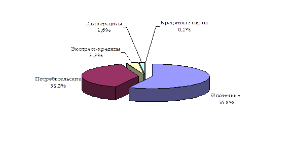 В разрезе отраслевой концентрации корпоративного портфеля на долю четырех отраслей экономики приходится 88% выданных займов (торговля – 39,1%, жилищное строительство – 16,9%, производство – 12,4%, услуги – 19,2%). Таблица 2.11 Структура розничных займов в разрезе программ кредитования по состоянию на 01.01.10г.
