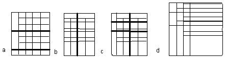 Рис. 3. Примеры таблиц иерархической структуры: a) Таблица с горизонтальной иерархией; b) Таблица с вертикальной иерархией; c) Таблица с горизонтальной и вертикальной иерархией; d) Таблица с двумя уровнями горизонтальной иерархии. Строки могут быть разбиты на подстроки, различающиеся какими-то свойствами (например, шрифтом). Объекты иерархической структуры могут иметь дочерей как на следующем по порядку иерархическом уровне (например, дочерьми параграфа могут быть строки), так и на более низком иерархическом уровне (например, дочерьми колонки могут быть символы). Модель описания структуры табличных форм - обобщенная модель связанных ортогональных иерархий; Рассмотрим особенности табличных структур, определяющие необходимость использования специальной модели для их описания: Правильное понимание таблицы читателем невозможно без учета информации о взаимном расположении строк, колонок и ячеек таблицы. Поэтому при автоматизированном распознавании табличных форм необходимо в выходном документе сохранить то же взаимное расположение этих структурных табличных элементов, что и в исходной таблице. Строки и колонки таблиц могут иметь иерархическую структуру (рис. 3), причем иерархия может быть многоуровневой (рис. 3,d). Колонки и горизонтальные блоки различных иерархических уровней в таблицах могут иметь заголовки. Ориентация текста в заголовках может быть как горизонтальной, так и вертикальной. Колонки и строки в таблицах могут быть разделены линиями. Толщина линии, ее тип (например, одинарная или двойная, сплошная или пунктирная), а также сам факт наличия или отсутствия разделительной линии между двумя колонками или строками таблицы могут быть связаны определенным образом со структурой и семантикой таблицы и, следовательно, при автоматизированном распознавании таблиц должны быть отражены в случае необходимости в выходном документе. С учетом перечисленных особенностей ясно, что ни дерево регулярного ортогонального чередования, ни матричная структура в большинстве случаев не подходят для моделирования структуры табличных форм. Хотя дерево регулярного ортогонального чередования и сохраняет некоторую информацию о взаимном расположении элементов таблицы, этой информации недостаточно, чтобы воспроизвести исходную структуру таблицы в выходном документе. Пример приведен на рис. 4. Хотя структура таблиц на рис. 4, a) и b), различна, деревья регулярного ортогонального чередования, описывающие структуру этих таблиц, совпадают (см. рис. 4c). Неприменима в общем случае к таблицам и матричная структура, так как она не позволяет описывать таблицы с иерархической организацией. Чтобы выяснить, какая модель данных может быть использована для представления таблиц, рассмотрим сначала общепринятую в технической документации структуру таблиц. Обычно таблица состоит из шапки, может быть, боковика и так называемого "тела" таблицы (рис. 5), причем как шапка, так и боковик могут иметь иерархическую структуру (рис. 6). Модель такой таблицы может состоять из дерева горизонтальной иерархии, описывающего структуру боковика, дерева вертикальной иерархии, описывающего структуру шапки и связей между деревьями горизонтальной и вертикальной иерархий. Рассмотренную модель будем называть обобщенной моделью связанных ортогональных иерархий. Пример оп