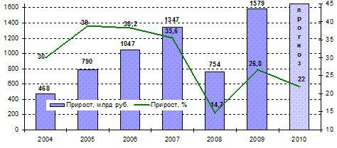 Прирост средств населения 3,3% в III квартале 2010 г. - это также несколько заниженная оценка вследствие укрепления рубля и заметной доли валютных депозитов. Без учета курсовых колебаний темп прироста вкладов был выше и по расчетам АСВ, составил 3,7-3,9%. В IV квартале начиная с середины ноября приток средств населения стал быстро увеличиваться под влиянием предновогодних премиальных выплат, что принесло банковской системе в последние полтора месяца дополнительно 520 млрд. руб. (33% всего прироста за год: в 2006-2007 гг. предновогодние премии давали лишь 16-20% годового прироста вкладов). Почти половина этих средств (250 млрд. руб.) образовалась за счет увеличения остатков на текущих счетах и счетах до востребования, что подтверждает разовый и, возможно, кратковременный характер появления этих средств в банковской системе. Можно предположить, что в условиях снижающихся процентных ставок по депозитам часть этих средств в ближайшее время может перейти на фондовый рынок либо на рынок недвижимости. Указанное подтверждается, в частности, быстрым ростом числа сделок на рынке недвижимости в декабре 2009 г. - январе 2010 г. Рис.2. Прирост вкладов населения в 2004-2010гг. (млрд. руб.) млрд. руб. 1650%