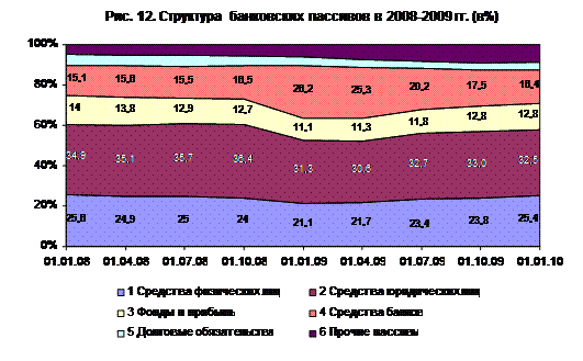 Общая сумма банковских вкладов физических лиц на 1 января 2010 г. составила 19,1% ВВП, увеличившись за год на 4,8 п. п. 3) Вклады населения стали более значимым ресурсом для развития банковской системы, их доля в пассивах банков стала возрастать. После введения ССВ наблюдалась общая тенденция - рост доли вкладов населения в совокупных пассивах банковской системы до 28,3% к началу 2006 г. После достижения максимума в 2004-2006 гг., доля вкладов физических лиц в банковских пассивах стала снижаться. Сокращение доли вкладов физических лиц происходило вследствие активного развития банковских систем и опережающего роста других источников финансирования, таких как: внешние займы, средства небанковских юридических лиц, собственный капитал и прибыль банков. По состоянию на 1 января 2010 г. на долю вкладов населения приходится 25,4% пассивов банковской системы, на средства юридических лиц - 32,5%. Рис.4. Структура банковских пассивов в 2008-2009 гг. (в%)