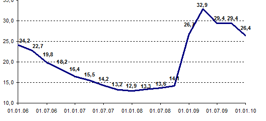 Последние несколько лет доля вкладов населения в банковских пассивах снижалась, что было связано с опережающим ростом собственных средств банков, привлеченных средств юридических лиц и средств банков, в том числе в результате роста иностранных заимствований. За 2008 г. удельный вес депозитов физических лиц сократился на 4,5 п. п. с 25,6% до 21,1%, причем основное сокращение пришлось на IV квартал, когда доля вкладов населения сократилась на 2,9 п. п., а Банк России значительно увеличил предоставление кредитов. В 2009 г. ситуация изменилась, и доля средств физических лиц в пассивах банков выросла на 4,3 п. п. с 21,1 до 25,4%, в основном за счет притока средств во вклады и снижения средств банков, в том числе Банка России. Причиной этого стала возросшая после кризиса активность по привлечение средств населения во вклады. Рис.5. Доля средств населения в совокупных пассивах банковской системы в 2006-2009 гг. (в%)